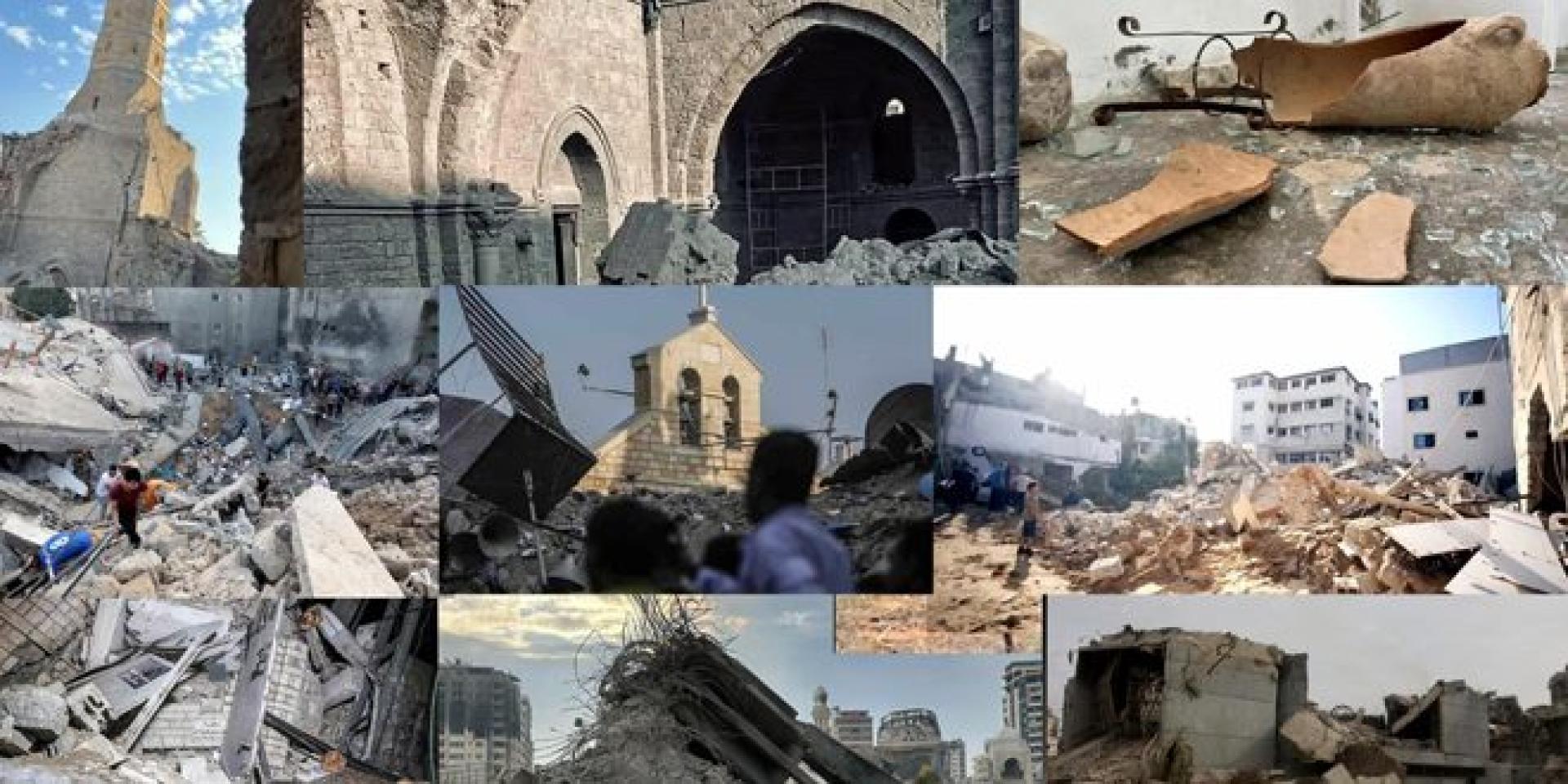 طيران الاحتلال دمر المسجد الكبير أحد أهم وأقدم مساجد فلسطين، حيث يعود تاريخ إنشائه إلى أكثر من 3 آلاف عام وكنيسة القديس برفيريوس في حي الزيتون وهي من أقدم الكنائس في العالم ويعود تاريخ بنائها إلى عام 425 ميلادي قبل أن يتم تجديدها عام 1856، والكنيسة البيزنطية التي يزيد عمرها على 1600 عام إذ تعود إلى عام 444 ميلادي إلى جانب متحف رفح الذي يعد مقصداً لدارسي تاريخ القطاع وتراثه كما دمر 9 دور نشر ومكتبات و6 مراكز ثقافية وألحق أضراراً بـ 15أخرى.